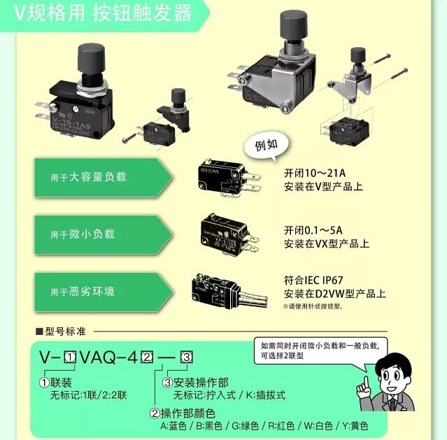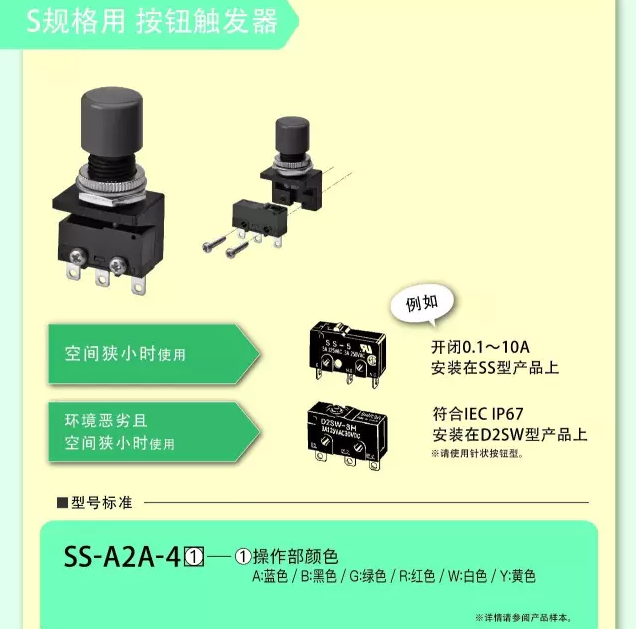 2、微動(dòng)開(kāi)關(guān)可通過(guò)自由組合方式設(shè)定按鈕,適用對(duì)象涵蓋從微小負(fù)載到密封構(gòu)造的廣泛領(lǐng)域