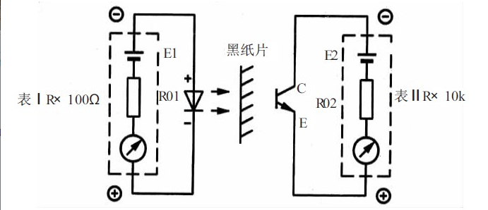 采用“雙表法”檢查光電開關(guān)的電路如圖2 所示。為避免外界光線的影響,應(yīng)盡量在暗處檢測光電開關(guān)。具體方法是:將表Ⅰ撥至R×100 Ω 檔向發(fā)射管提供正向電壓,表Ⅱ置于R×10 kΩ 檔測量c-e 極間電阻。把黑紙片放在發(fā)射窗與接收窗中間,用來阻擋紅外線。上、下抽動(dòng)紙片時(shí)應(yīng)觀察到表Ⅱ指針有明顯的擺動(dòng)。在測試條件不變的情況下,指針擺幅愈大,說明器件的靈敏度愈高。