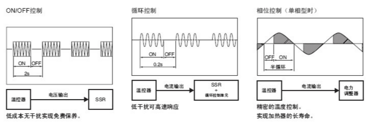 控制、循環(huán)控制、 相位控制) ON/OFF控制接受溫控器的電壓輸出信 號, 通過開關(guān)SSR來控制加熱器的 ON/OFF。在電磁繼電器中也可進行相同 的控制, 但是以數(shù)秒間隔控制ON/OFF, 使用數(shù)年時需要SSR。 循環(huán)控制(G32A-EA) 以0.2秒(固定) 為 控制周期。其方式是使其在0.2秒內(nèi) ON/OFF, 從而控制輸出電力。 接受溫控器的電流輸出4~20mA來控制。