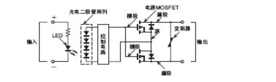 MOS FET繼電器是在輸出元件中使用功率MOS FET的SSR。為使功率MOS FET動作, 光電二極管陣列作為受光元件使用。輸入端子中有電流流過時, LED會發(fā)光。這個光使光電二極管陣列中發(fā)生光電流, 這使柵極電壓使功率MOS FET置于ON。用源共通連接2個功率MOS FET, 可控制AC負載。DC專用的類型中有帶1個電源 MOS FET的類型。