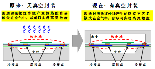 這次,世界首次成功將熱電堆真空封裝在芯片內。采用真空封裝即可避免將熱電堆轉換的熱能散失在空氣中,使金屬接點之間的溫差變大,從而可實現(xiàn)更高的靈敏度。
