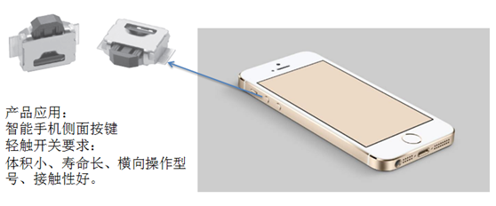 (一)智能手機(jī):建議使用橫向操作型號(hào)開關(guān)B3U-3000P-B型號(hào),用于智能手機(jī)側(cè)面按鍵,功能為控制開關(guān)電源、控制手機(jī)喇叭的音量。