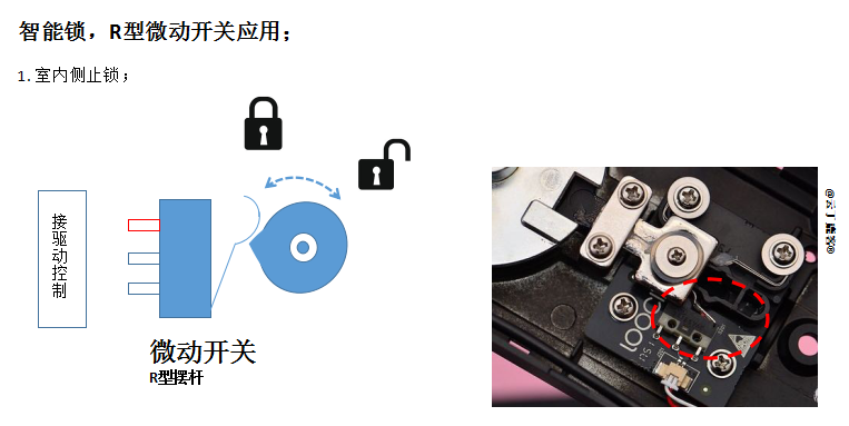 但除了這種常規(guī)的直擺桿型微動(dòng)開(kāi)關(guān), 還有一種R型擺桿的微動(dòng)開(kāi)關(guān)也在智能鎖里應(yīng)用; 見(jiàn)下圖; R型擺桿的微動(dòng)開(kāi)關(guān), 用在室內(nèi)側(cè), 類似于反鎖的機(jī)制;事實(shí)上不是反鎖, 該功能叫“室內(nèi)側(cè)止鎖”, 用于防止屋內(nèi)側(cè)的寵物或小孩,不經(jīng)意觸到把手, 而把鎖打開(kāi), 而此時(shí)大人/主人又不在現(xiàn)場(chǎng), 繼而產(chǎn)生不安全的存在。