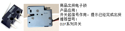 (3)產(chǎn)品推廣三:商品出貨電子鎖,推薦使用歐姆龍小型微動(dòng)開(kāi)關(guān),主要是在出貨完成后給信號(hào)主機(jī),體積已完成出貨: