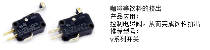 (4)產(chǎn)品推廣四:咖啡等飲料的擠出,推薦使用歐姆龍大容量V系列微動(dòng)開(kāi)關(guān),用于控制電磁閥,實(shí)現(xiàn)飲料擠出的功能: