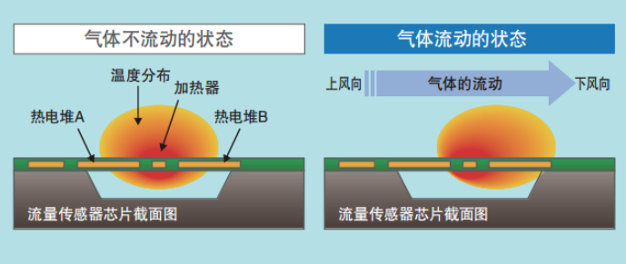 歐姆龍MEMS流量傳感器檢測(cè)原理:在沒有氣體流動(dòng)的情況下以加熱器為中心,溫度分布左右對(duì)稱。流動(dòng)的狀態(tài)下,加熱器上風(fēng)向的溫度低,下風(fēng)向溫度高,溫度分布不再對(duì)稱。將該溫差作為熱電堆的電動(dòng)勢(shì)之差進(jìn)行傳感,可測(cè)量流量、流速而不影響溫度、壓力。此外,熱電堆為熱電動(dòng)勢(shì)方式,與電阻式相比,有助于降低功耗。