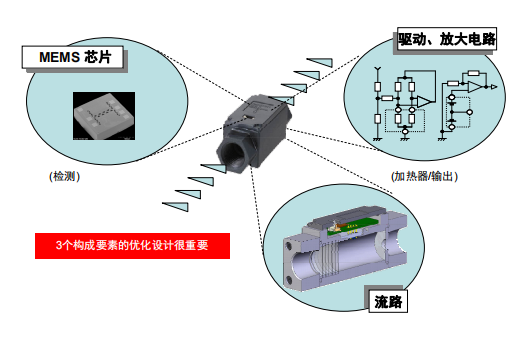 歐姆龍的流量傳感器為氣體專用,可測量各種氣體的質(zhì)量流量。流量傳感器的基本構(gòu)成由測量流量的 MEMS 流量傳感器芯片、放大其輸出的放大電路、以及根據(jù)使用用途經(jīng)CAE(computer-aided engineering)優(yōu)化的流路結(jié)構(gòu)構(gòu)成。由于氣流是矢量流,因此這三個構(gòu)成要素的優(yōu)化設(shè)計非常重要。