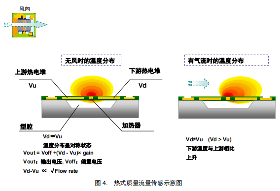 如圖 4 所示,恒定電流流向芯片中央的加熱器,產(chǎn)生熱量。無風(fēng)時,加熱器周圍的熱分布是對稱的,因此 Vu 和 Vd 兩個熱電堆的電動勢相等。