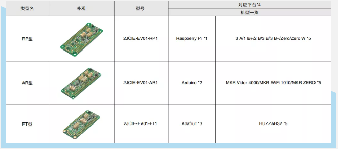 2JCIE-EV評估板共有以下三種型號:2JCIE-EV01-RP1、2JCIE-EV01-AR1、2JCIE-EV01-FT1,分別對應(yīng)了Raspberry Pi*1、Arduino*2、Adafruit*3三大平臺。