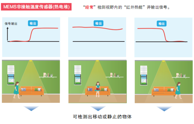 歐姆龍自主研發(fā)的D6T系列非接觸溫度傳感器, 采用獨創(chuàng)的MEMS技術,將熱電堆元件和ASIC封裝在一起,實現(xiàn)了精度高,體積小,便于嵌入多種電子產(chǎn)品等特點。與熱釋電型紅外傳感器相比, 歐姆龍D6T系列非接觸傳感器不僅可以檢測動態(tài)物體,也可檢測靜止物體。通過物體表面細微的溫度差和溫度變化進行檢測, 不僅適用于家電節(jié)能、安防設備、樓宇建筑等領域,也適用于護理看護類的應用場景。