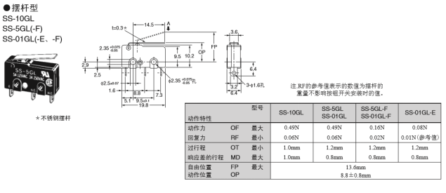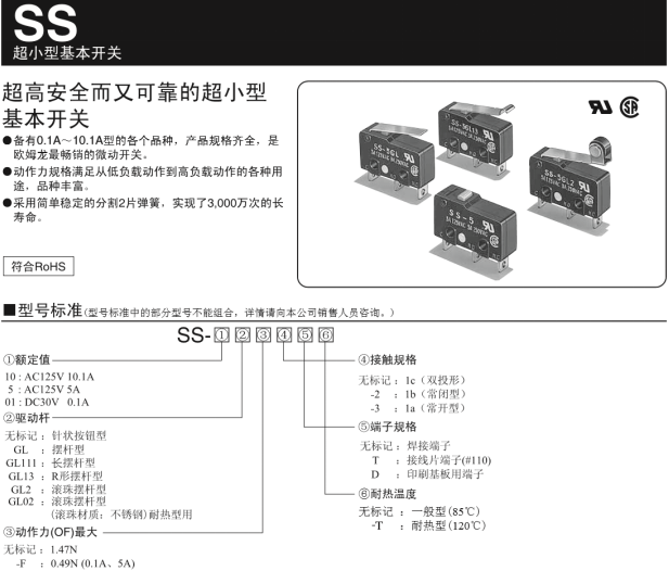 所以,對于微動(dòng)開關(guān)品牌的選擇還是不能馬虎的,鼎悅小編為您推薦世界知名品牌歐姆龍微動(dòng)開關(guān):具有超高安全、超長壽命、超小尺寸的微動(dòng)開關(guān)SS系列。 具體技術(shù)參數(shù):