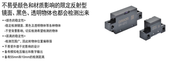 歐姆龍傳感器抗陽光干擾強,可穩(wěn)定檢測鏡面、黑色、透明物體,推出限定反射型傳感器B5W系列。接受來自檢測物體的反射光以檢測物體有無,擁有限定了投光光束和受光區(qū)域的光學系統(tǒng),僅可檢測相距傳感器一定距離(投光光束與受光區(qū)域重合的范圍)的檢測物體。