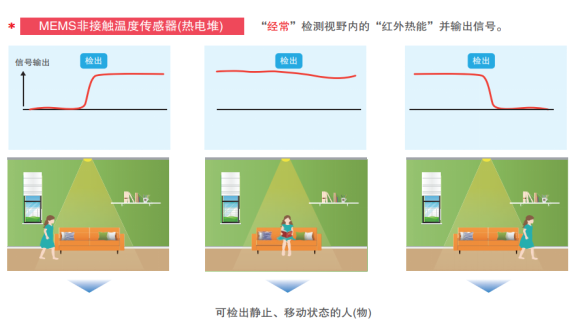 與只能檢測動(dòng)態(tài)物體的熱釋電紅外傳感器,歐姆龍D6T傳感器不僅能檢測動(dòng)態(tài)物體,也能檢測靜止物體,實(shí)現(xiàn)即時(shí)檢測物體的溫度變化。