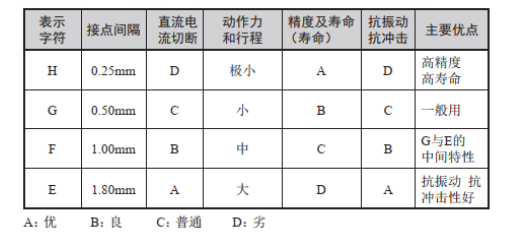 不同的接點(diǎn)間隔,開關(guān)行程的移動差(即MD:從驅(qū)動桿的動作位置到復(fù)位位置的移動距離或者移動角度)、靈敏度、壽命、直流電流切斷、抗沖擊、抗振動的能力都不同。