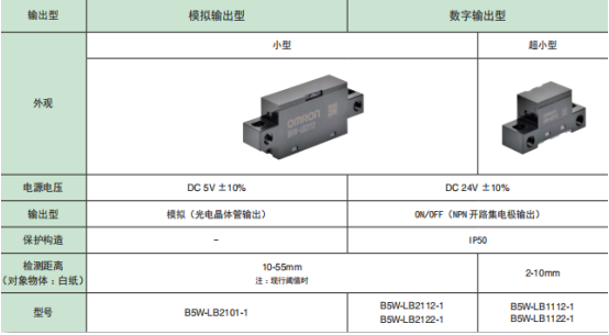 歐姆龍限定反射傳感器B5W-LB系列檢測范圍廣,因此耐物體位置偏移強(qiáng),不易受外部干擾影響的設(shè)計(jì)。備有模擬電壓輸出和數(shù)字輸出兩種輸出模式。