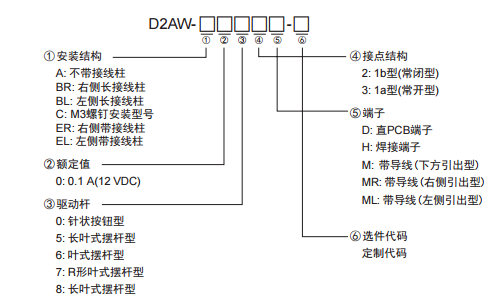 歐姆龍D2AW微動開關具有小型的外觀尺寸,并且根據(jù)安裝結構、額定值、驅動桿類型、節(jié)點結構、端子以及定制代碼的不同,可提供多種型號產品,以便客戶根據(jù)實際應用需求進行選擇。