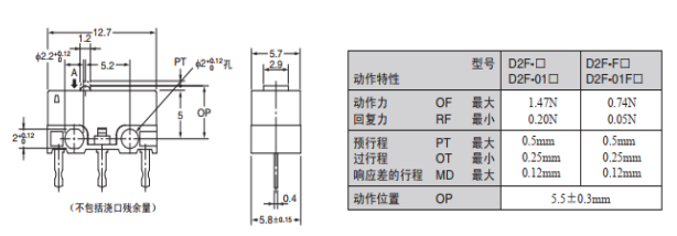 歐姆龍微動(dòng)開(kāi)關(guān)D2F-F的優(yōu)勢(shì):超小型,性能穩(wěn)定,動(dòng)作力只需要0.74N,能夠更精準(zhǔn)地感應(yīng)剎車片磨損的程度,為風(fēng)力發(fā)電機(jī)的安全運(yùn)作提供給更有力的保障,以下是D2F-F的尺寸圖和動(dòng)作特性。