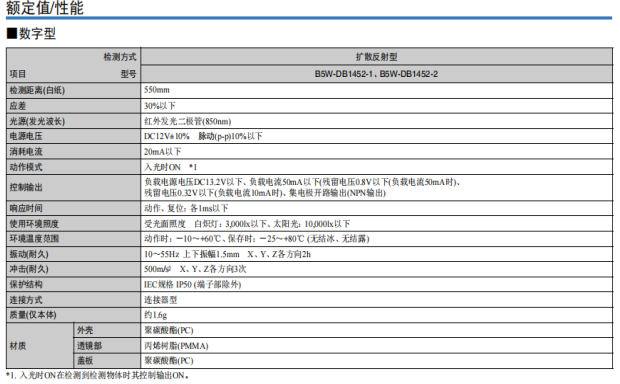 歐姆龍B5W-DB的光源為紅外發(fā)光二極管(850nm),受光面照度在白熾燈的情況下為3,000lx以下、太陽光的照度下為10,000lx以下。不僅如此,B5W-DB的外殼采用聚碳酸酯(PC)、透鏡部采用丙烯樹脂(PMMA)、蓋板采用聚碳酸酯(PC)材質(zhì),保護(hù)結(jié)構(gòu)符合IEC規(guī)格IP50標(biāo)準(zhǔn)(端子部除外),可幫助設(shè)備實現(xiàn)強耐用性。