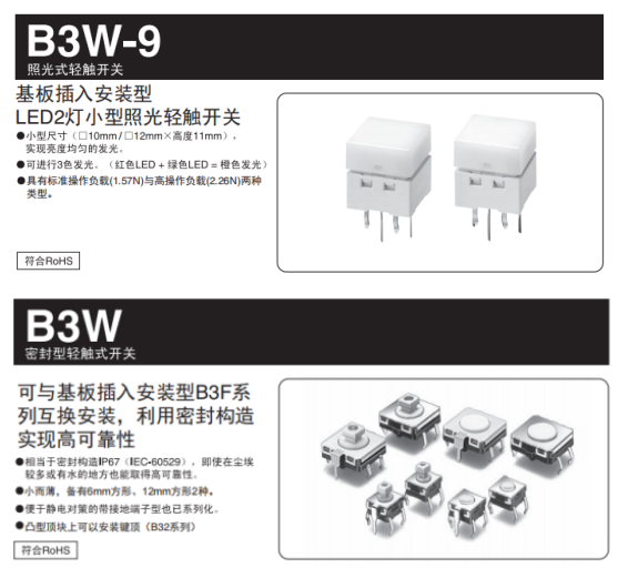 首先來聊聊什么商用飲水機上可以用我們歐姆龍的哪些產(chǎn)品,這里小編給大家推薦可以應用在飲水機上面歐姆龍的輕觸開關(guān),B3W防水系列和B3W-9帶燈的系列,都可應用。