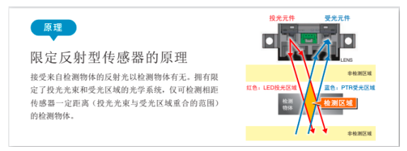 B5W-LB系列是限定反射型傳感器(如圖三),搭載了由4種超環(huán)面透鏡組成的歐姆龍自行設(shè)計(jì)的光學(xué)鏡頭。只需微弱的反射光即可實(shí)現(xiàn)穩(wěn)定檢測,不易受檢測物體的顏色和表面狀態(tài)影響,可在廣泛檢測區(qū)域內(nèi)檢測黑紙和透明玻璃等。