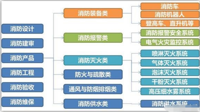 消防產(chǎn)業(yè)鏈中,主要分為消防設(shè)計(jì)、消防建審、消防產(chǎn)品、消防工程、消防驗(yàn)收、消防維保等環(huán)節(jié)。