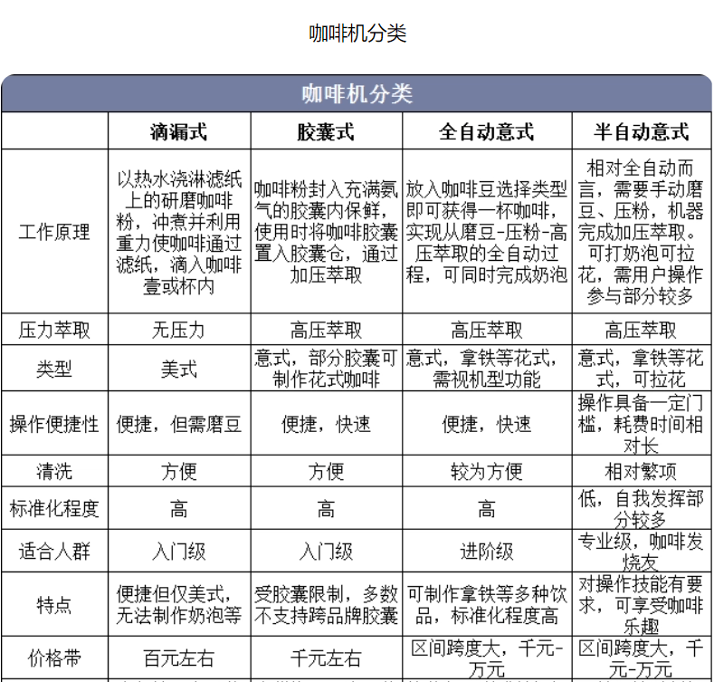 人們把電子技術(shù)應(yīng)用到咖啡機(jī)上,實(shí)現(xiàn)了磨粉、壓粉、裝粉、沖泡、清除等釀制咖啡全過(guò)程的自動(dòng)控制,創(chuàng)造了咖啡機(jī)。具體分品類(lèi)來(lái)看,咖啡機(jī)根據(jù)萃取方式可主要分為滴漏式、膠囊式和壓力式(意式),根據(jù)工作方式可分為全自動(dòng)和半自動(dòng)(區(qū)別在于半自動(dòng)需要消費(fèi)者掌握一定的咖啡技能,磨豆、壓粉、打奶泡等多項(xiàng)步驟需手動(dòng)參與)。