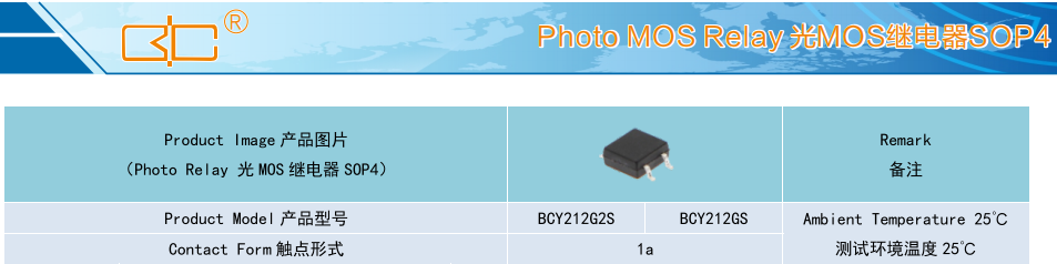 (Relay 光 MOS 繼電器 SOP4),Product Model產(chǎn)品型號:BCY212G2S/BCY212GS,Contact Form 觸點形式:1a,Ambient Temperature 25'C,測試環(huán)境溫度 25°C