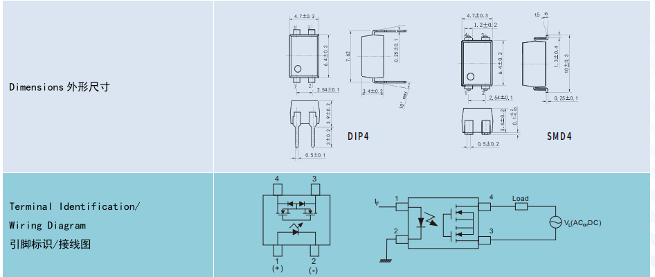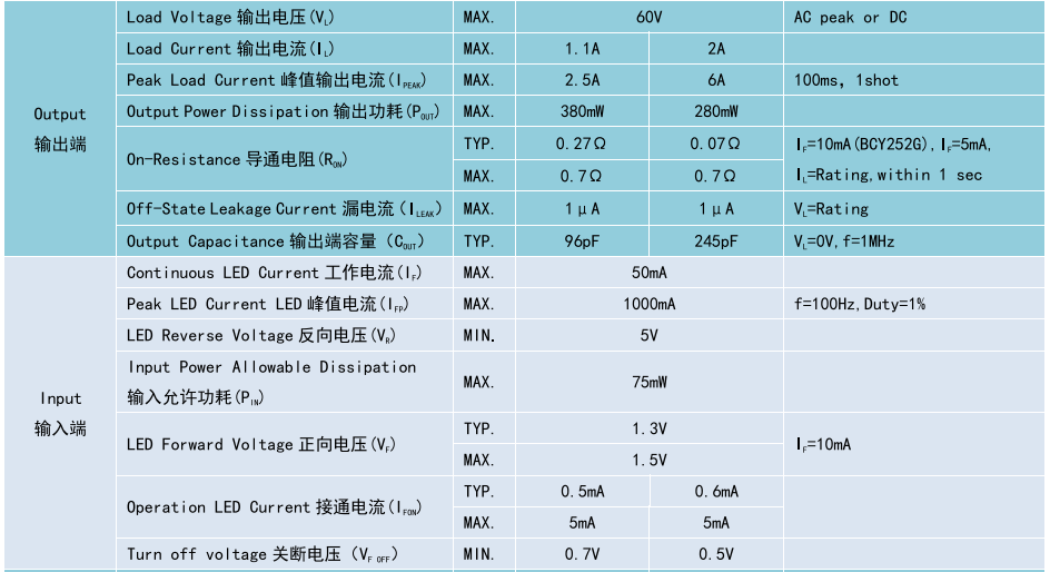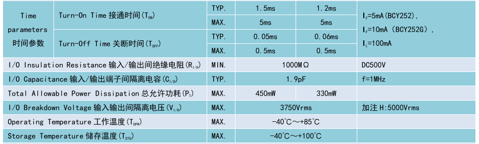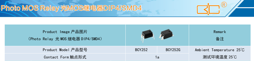 (Relay 光 MOS 繼電器 DIP4/SMD4),Product Model產(chǎn)品型號:BCY252、BCY252G,Contact Form 觸點形式:1a,Ambient Temperature 25°C測試環(huán)境溫度 25℃