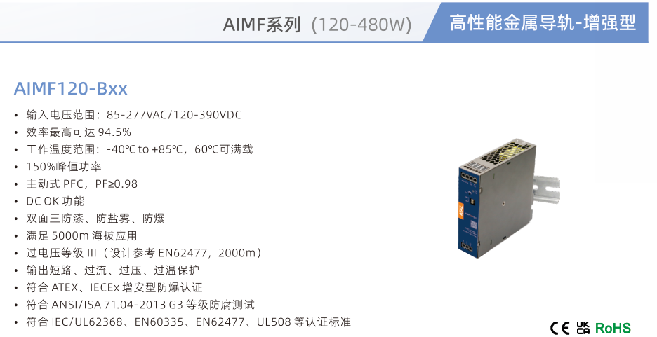 開關(guān)電源AIMF120-BxX, ?輸入電壓范圍:85-277VAC/120-390VDC ?效率最高可達(dá) 94.5% ?工作溫度范圍:-40℃to +85℃,60℃可滿載 ?150%峰值功率 ?主動(dòng)式 PFC,PF≥0.98 ?DCOK功能 ?雙面三防漆、防鹽霧、防爆 ?滿足 5000m 海拔應(yīng)用 ?過電壓等級(jí)川(設(shè)計(jì)參考 EN62477,2000m) ?輸出短路、過流、過壓、過溫保護(hù) ?符合 ATEX、IECEx增安型防爆認(rèn)證 ?符合ANSI/ISA71.04-2013G3等級(jí)防腐測試 ?符合IEC/