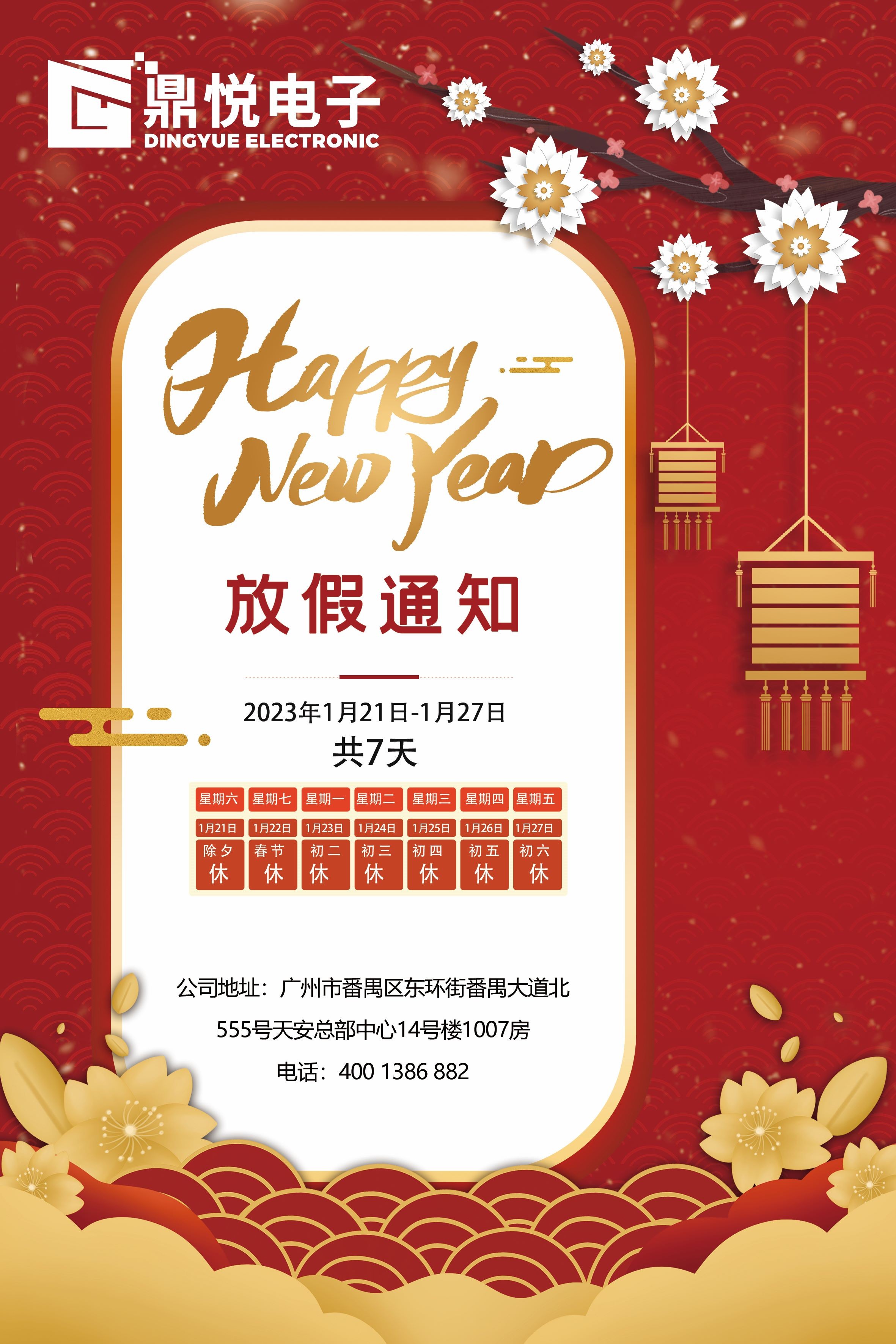 您好!感謝您對(duì)鼎悅電子的支持和厚愛(ài)!正值新春佳節(jié)來(lái)臨之際,廣州鼎悅電子科技有限公司攜全體員工在此向您及您的家人送出最真摯的祝福:祝您新年快樂(lè)!萬(wàn)事如意!在新的一年里身體健康!事業(yè)更上一層樓!在新的一年里我們也將以更真誠(chéng),專業(yè)的服務(wù)回饋廣大客戶!