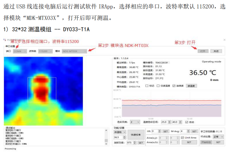 采用串口通信協(xié)議,波特率默認(rèn)115200,8數(shù)據(jù)位,1停止位,無校驗。其中用戶控制端是主機,測溫模組是從機,采用一發(fā)一收。協(xié)議輸出數(shù)據(jù)有兩種查詢命令方式,一是只查詢?nèi)梭w溫度,二是查詢陣列溫度數(shù)據(jù)。