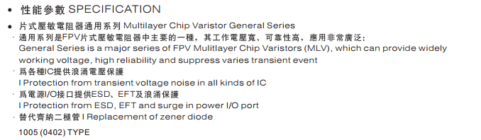 特征: 1、疊層片式陶瓷結(jié)構(gòu)。 2、無引線。 3、溫度范圍:-55℃~+125 ℃。 4、工作電壓范圍V w(dc)=3.3~ 615V。 5、具有雙向限制特性,適合ESD保護(hù)。 6、漏電流非常小。 7、寄生電感小、響應(yīng)速度快(響應(yīng)時間少于0.5ns)。 8、優(yōu)良的溫度系數(shù)。 9、良好的焊接性能(端電極為三層電鍍)。 應(yīng)用: 1、防止過電壓:當(dāng)施加的電壓升高到壓敏電壓時,壓敏電阻器的電流急劇上升,被保護(hù)設(shè)備的浪涌電壓迅速減小,從而使裝有壓敏電阻器的設(shè)備抗浪涌噪聲能力達(dá)到相應(yīng)要求。壓敏